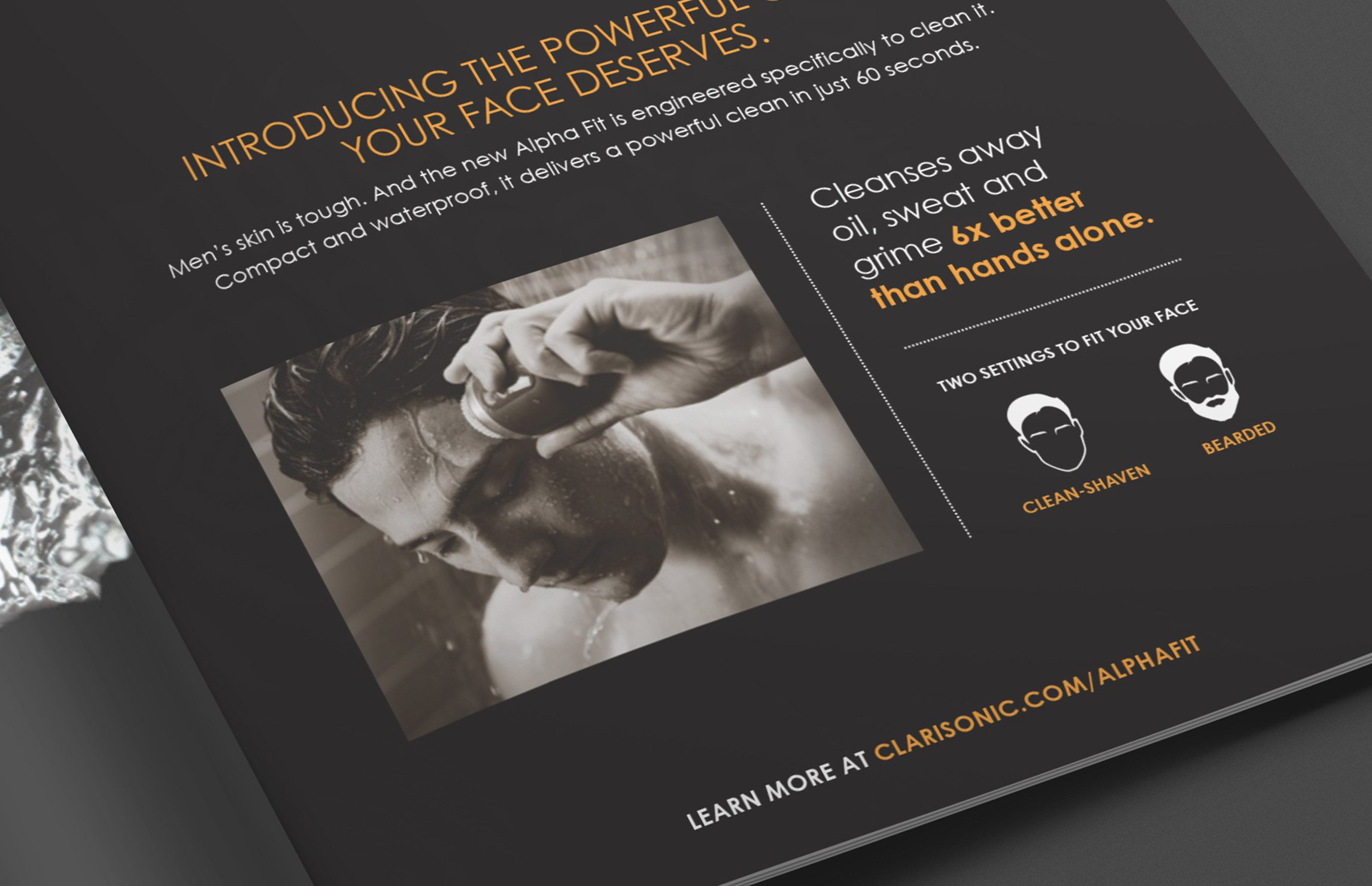 L’Oréal’s Clarisonic brand had long ruled the sonic skin-cleansing space, but their fans were almost all women. Alpha Fit was their play for a new audience: urban, professional men. Our challenge was to break into that market without leaning on tired “bro” tropes. The “Sonic. Boom.” campaign used just two words to convey both the power and tech behind the device, pairing bold type with photography that made its small size feel almost surprising given the experience it delivers.