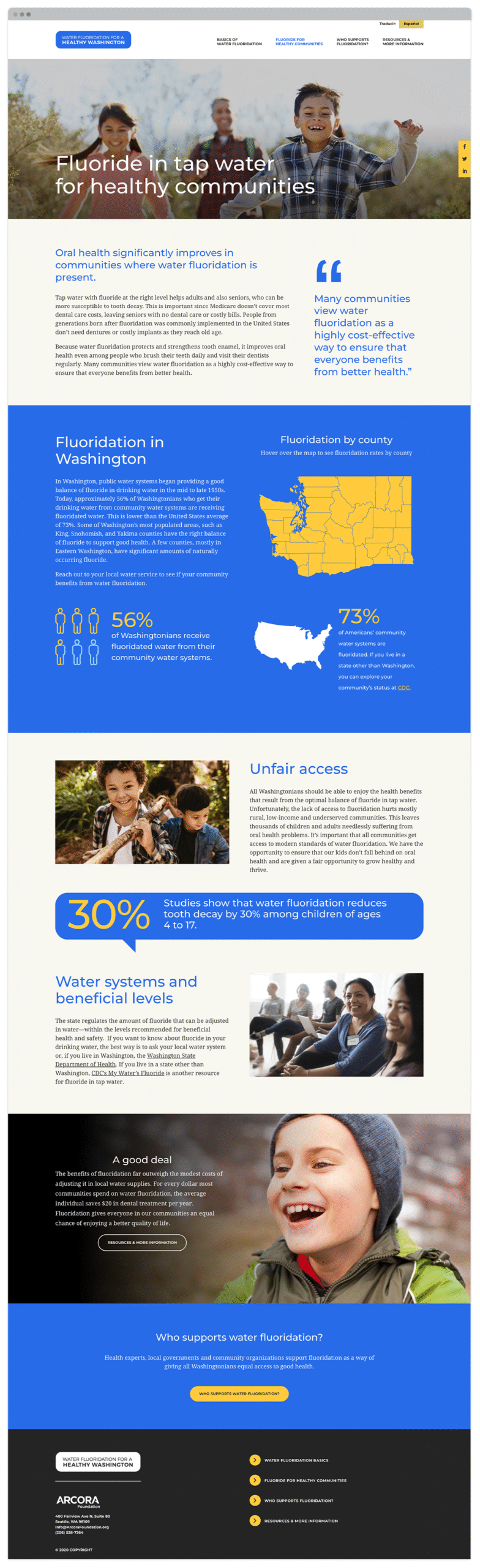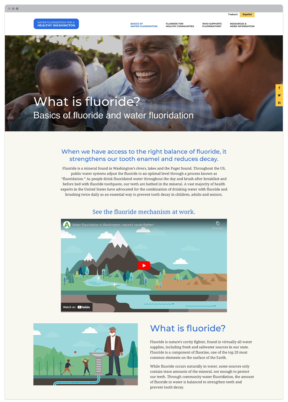 Fluoridated water has improved public health for decades, but misinformation still gets in the way—especially in communities where access is already unequal. Working with Resource Media, we built a bi-lingual website and animated video to make the case simply, clearly, and without getting lost in divisive rhetoric. Bright colors, friendly graphics, and human faces kept the focus on better health for everyone, with expert voices and real stories to back it up. Everything met high accessibility standards and was translated into Spanish for broader reach into underserved communities.
